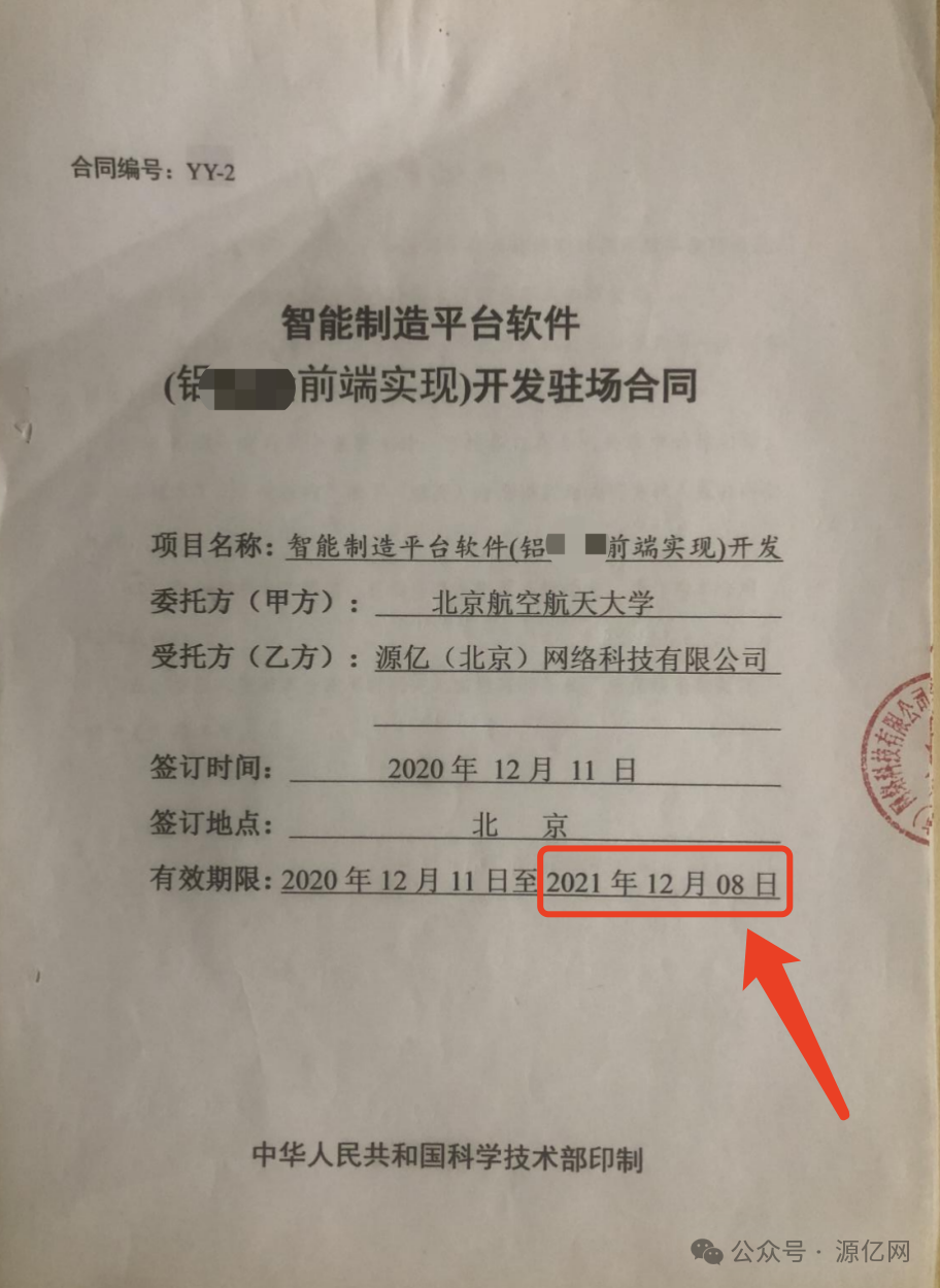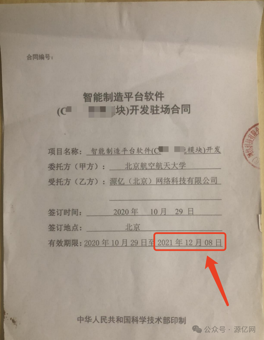 于2020 年 10 月 29 日北航和源亿网公司双方签订总周期框架合同《智能制造平台软件(CNC 功能模块)开发驻场合同》,约定源亿公司为北航提供技术驻场开发服务,约定项目总周期1年(合同第一条第5点:技术服务时间为 2020 年 11 月 9 日至 2021 年 12 月 8 日),同时约定本合同技术服务期限为 1 个月,以实现北航分月结技术服务费。